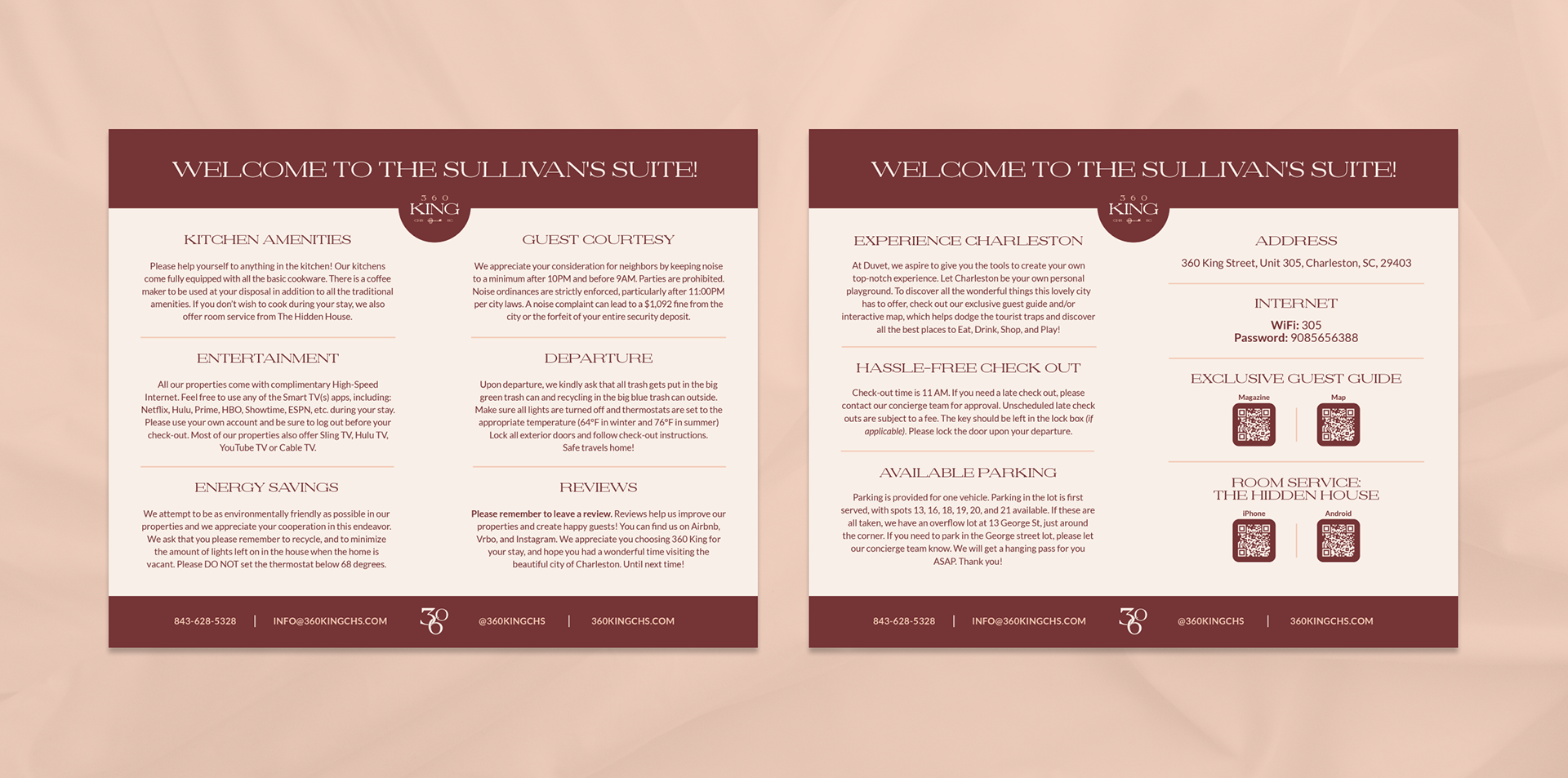 For 360 King, a luxury hotel in Charleston, I designed a suite of marketing materials aimed at enhancing the guest experience and promoting the hotel's unique offerings. This project involved creating Summary Cards for each room, highlighting key amenities and features in an elegant and concise format. Additionally, I designed a series of postcards that captured the hotel's sophisticated ambiance and the charm of Charleston, intended to serve as both a memento for guests and a promotional tool. The project focused on conveying the hotel's luxury brand through refined aesthetics and curated information, ensuring a seamless and memorable experience for guests.