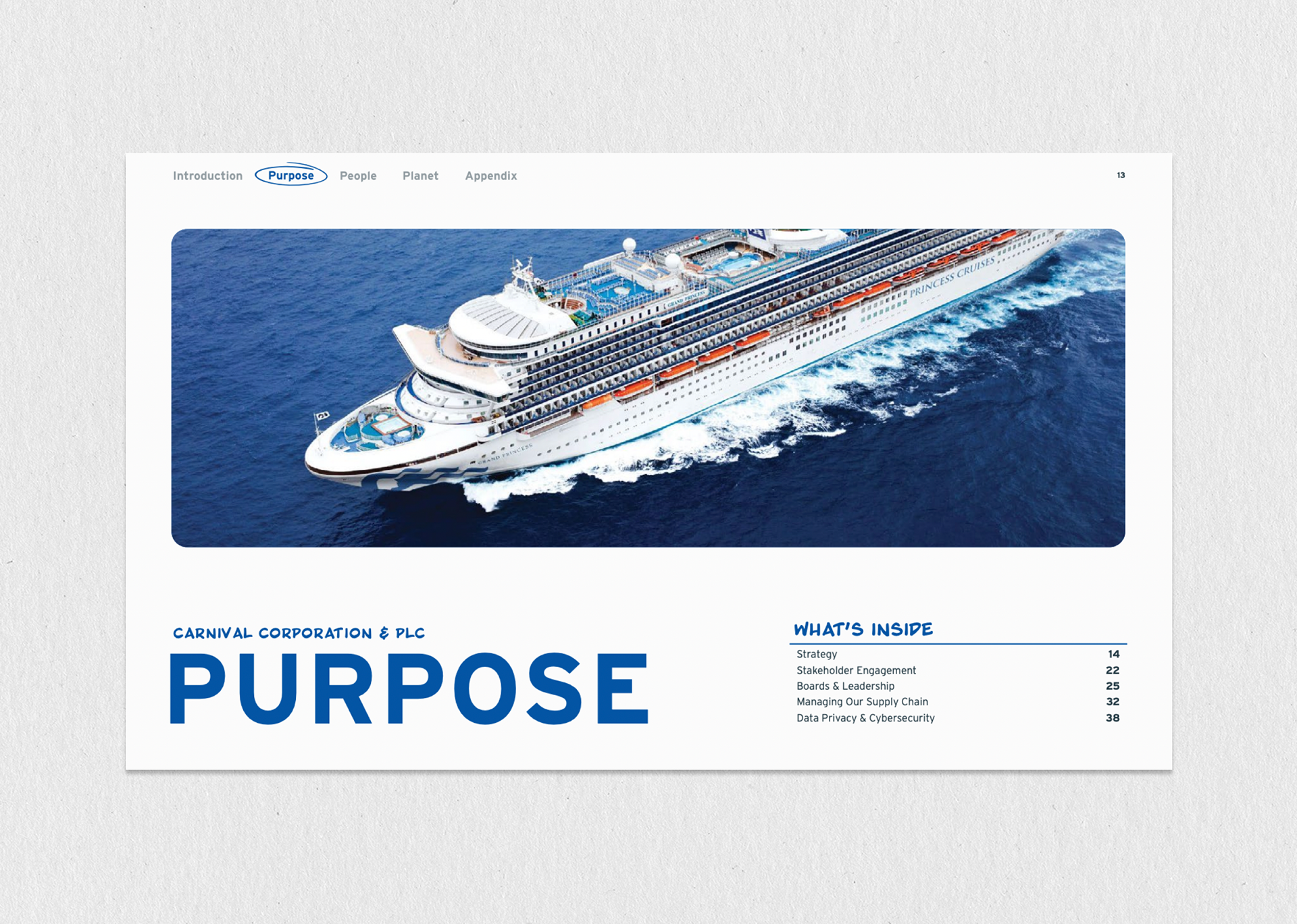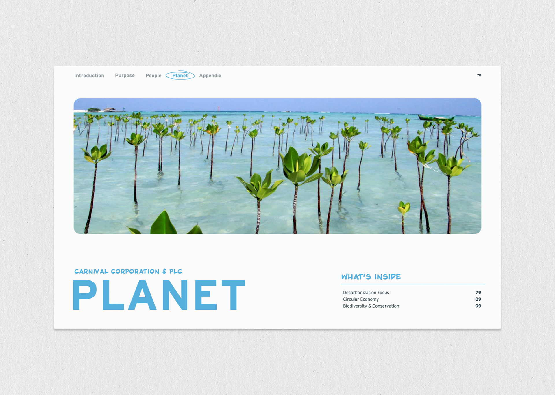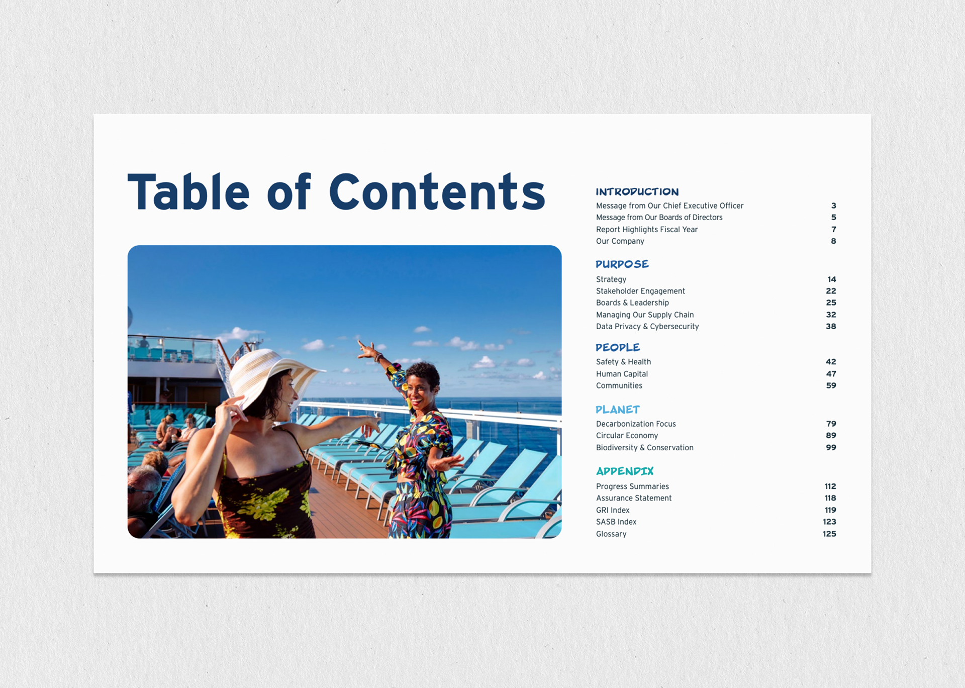 This project involved designing Carnival Cruise Line's extensive, 127-page annual Global Sustainability Report, a crucial corporate document used to communicate Environmental, Social, and Governance (ESG) performance to stakeholders. The primary challenge was transforming dense data and regulatory text into a visually engaging and accessible narrative, requiring the creation of a consistent modular layout and a full suite of custom infographics and data visualizations. The successful execution of this complex, high-page-count report was greatly supported by the strategic oversight and conceptual guidance provided by our Creative Director at The Found Gen, ensuring the final product maintained brand integrity and met rigorous corporate standards for transparency and professionalism.