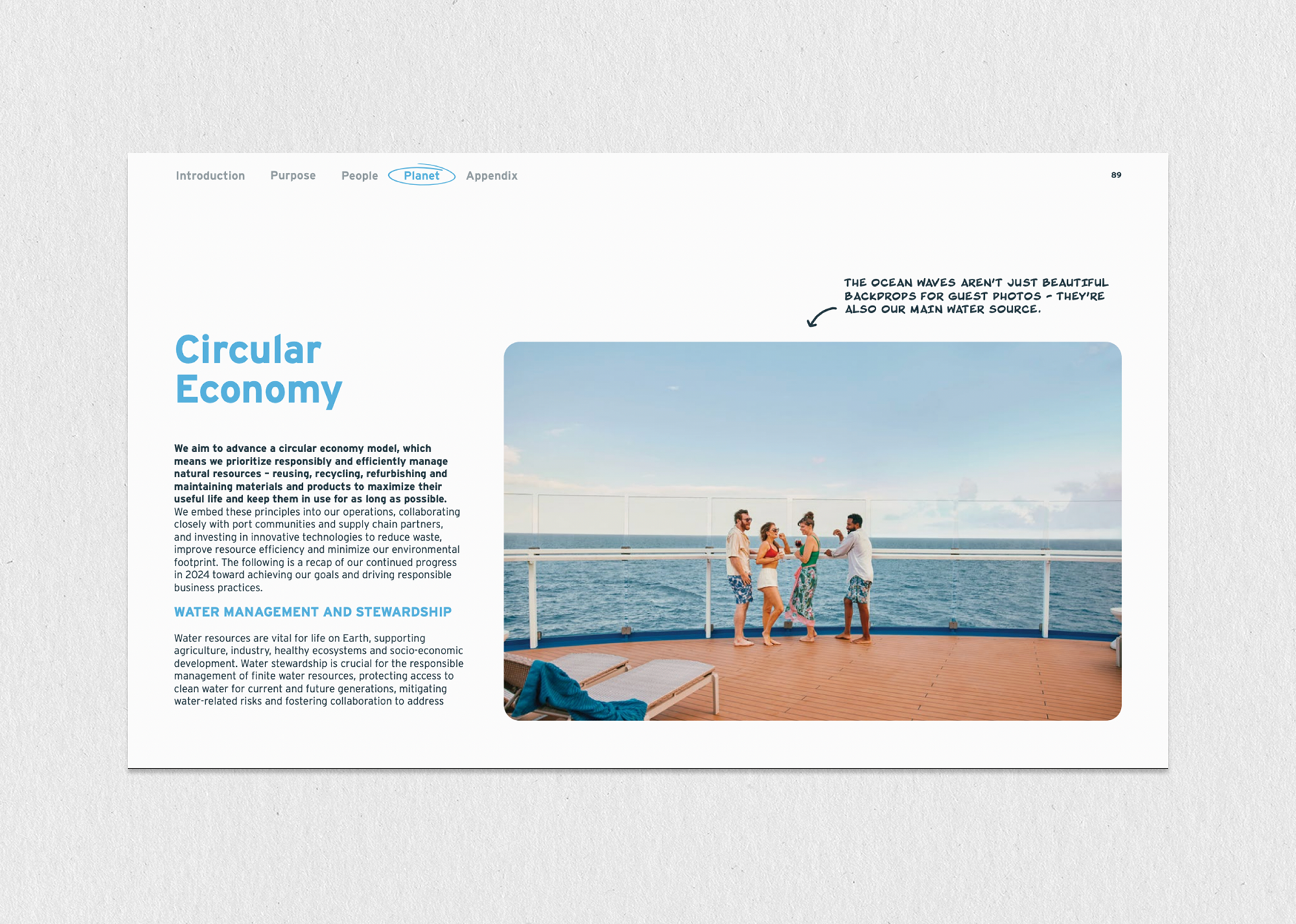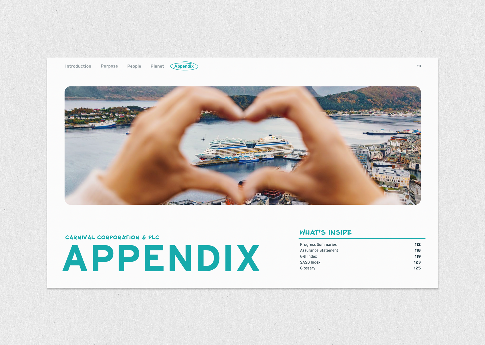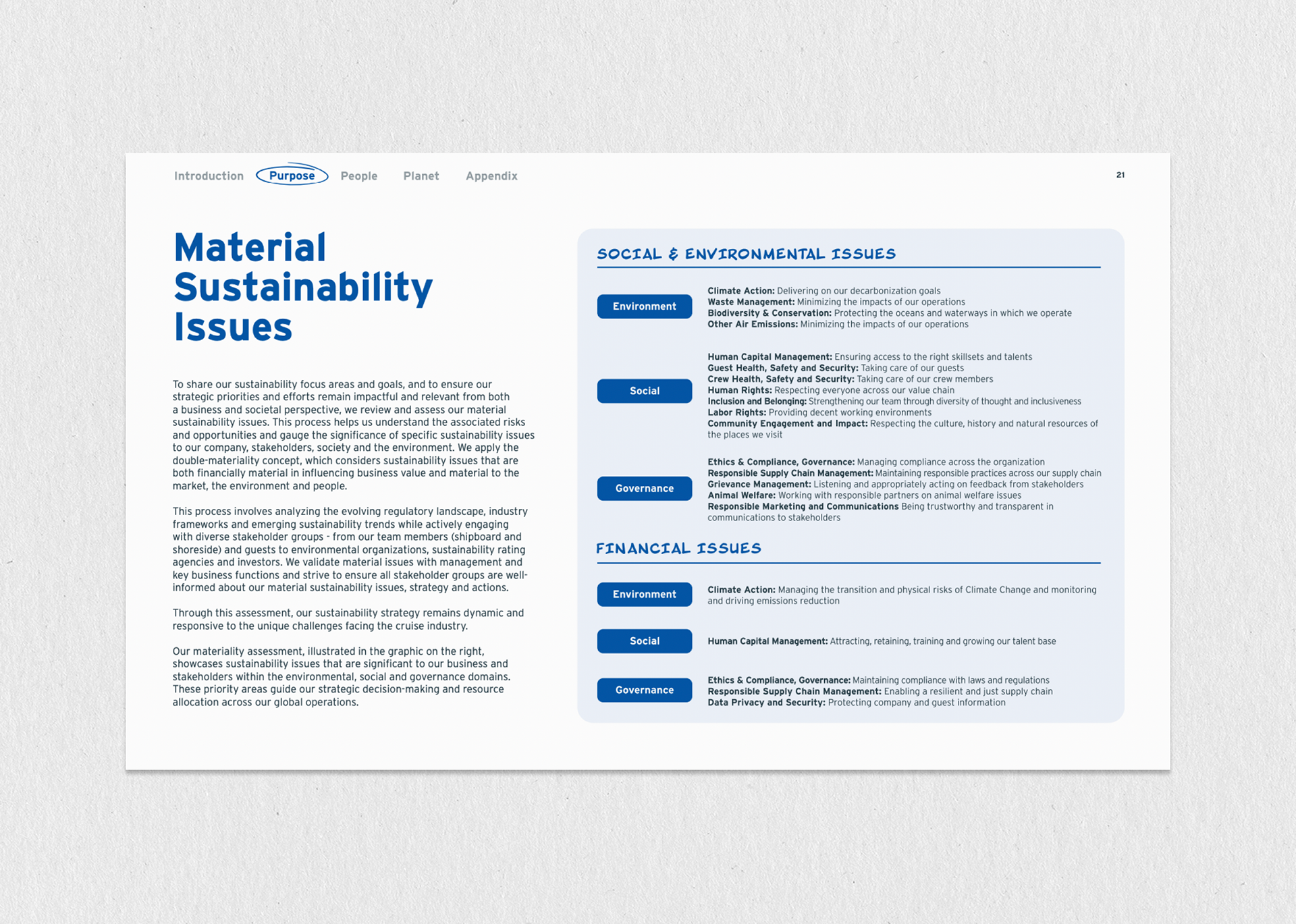 This project involved designing Carnival Cruise Line's extensive, 127-page annual Global Sustainability Report, a crucial corporate document used to communicate Environmental, Social, and Governance (ESG) performance to stakeholders. The primary challenge was transforming dense data and regulatory text into a visually engaging and accessible narrative, requiring the creation of a consistent modular layout and a full suite of custom infographics and data visualizations. The successful execution of this complex, high-page-count report was greatly supported by the strategic oversight and conceptual guidance provided by our Creative Director at The Found Gen, ensuring the final product maintained brand integrity and met rigorous corporate standards for transparency and professionalism.